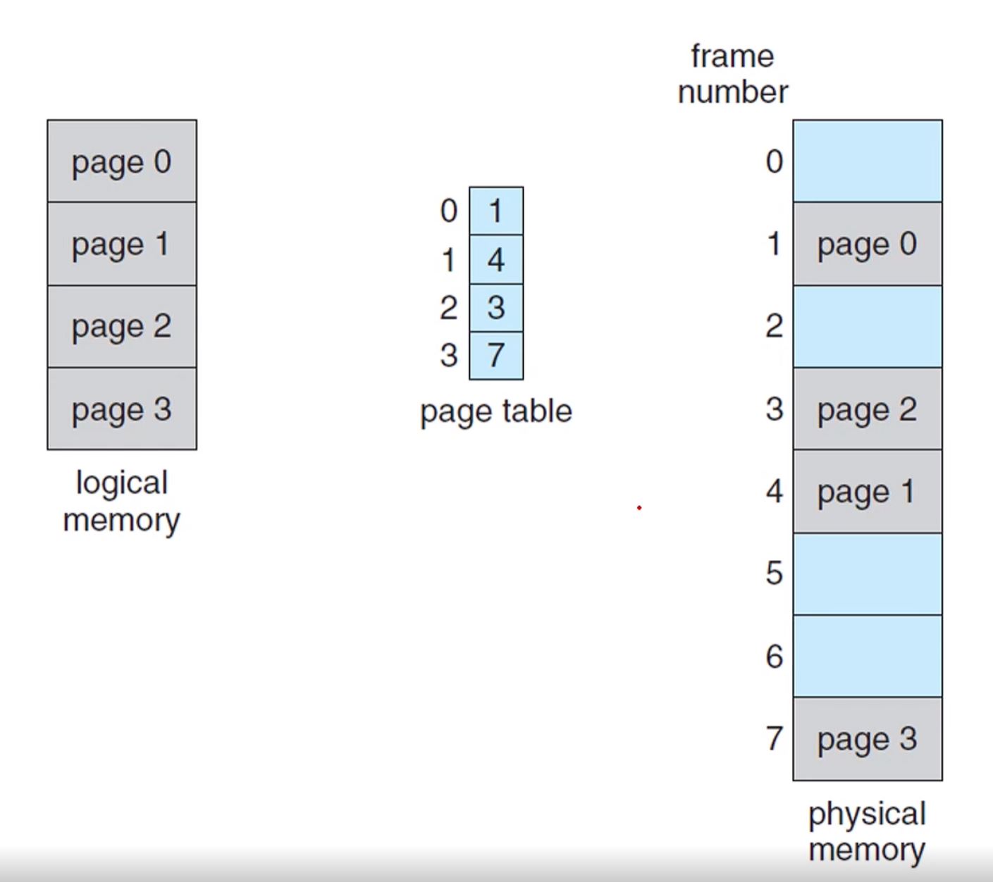 64KB 논리적 주소 공간을 1KB씩 페이지로 나눈 상태라면 이 페이지가 물리적 주소의 어느 프레임을 가더라도 상관이 없다.