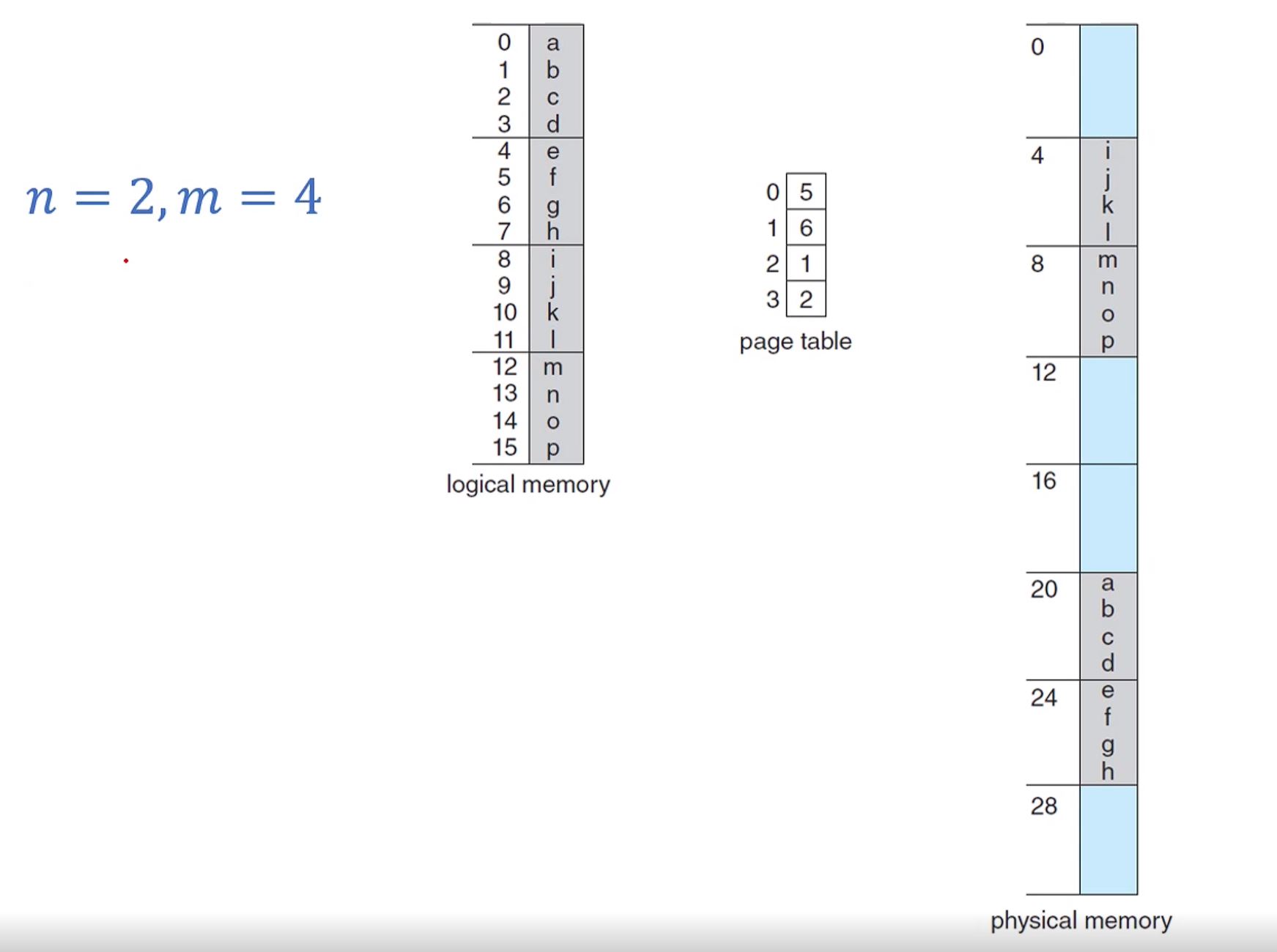 논리적 주소 공간은 2^m 으로 16이고 페이지의 크기는 2^n으로 4이다.
