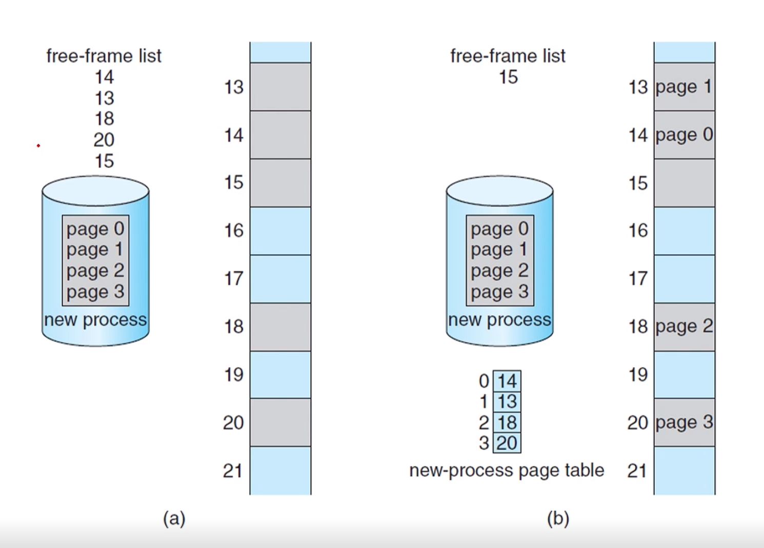 페이지들을 Memory Allocation 하기 위해서는 free-frame list의 순서에 기반해서 새로운 프로세스 페이지 테이블이 생성된다.